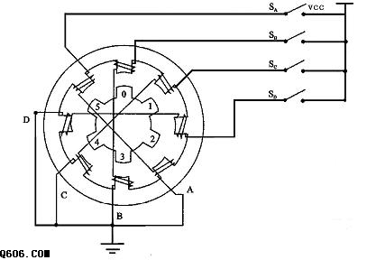 该步进电机为一四相步进电机,采用单极性直流电源供电。只要对步进电机的各相绕组按合适的时序通电,就能使步进电机步进转动。图1是该四相反应式步进电机工作原理示意图。